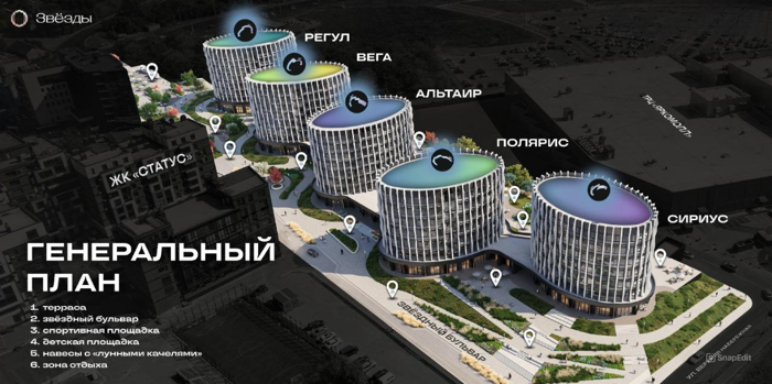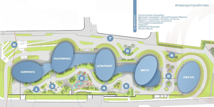 Пять клубных домов: Сириус, Полярис, Альтаир, Вега, Регул. Самые яркие звезды, видимые на ночном небе, теперь ярко освещают центр Иркутска.
