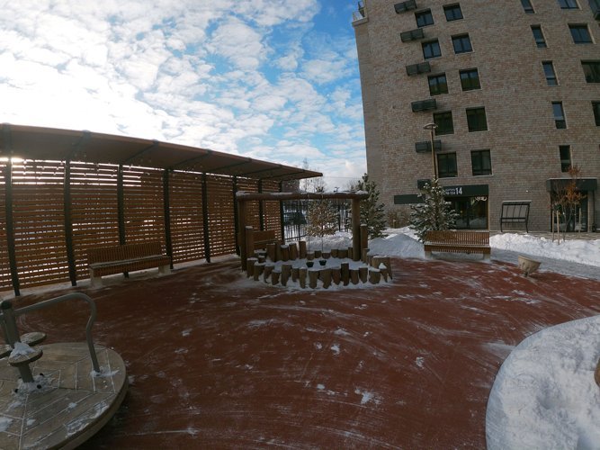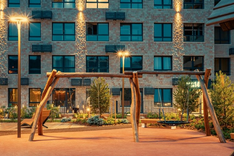 В дизайне фасада, детских площадок, помещений общественного пользования использованы натуральное дерево, камень, алюминиевые декоративные панели.